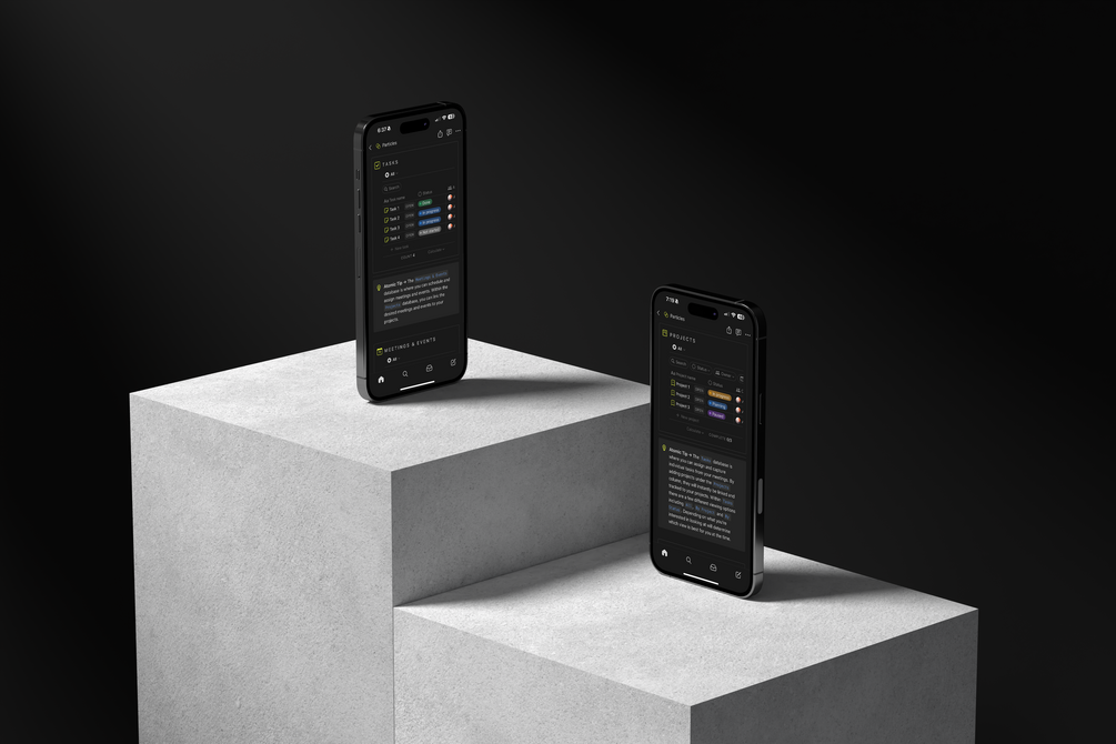 The core of Particles is the Projects database, which contains all the projects you're working on. Each project is linked to a higher-level Element (initiative) and is broken down into specific Tasks that need to be completed to move the project forward.